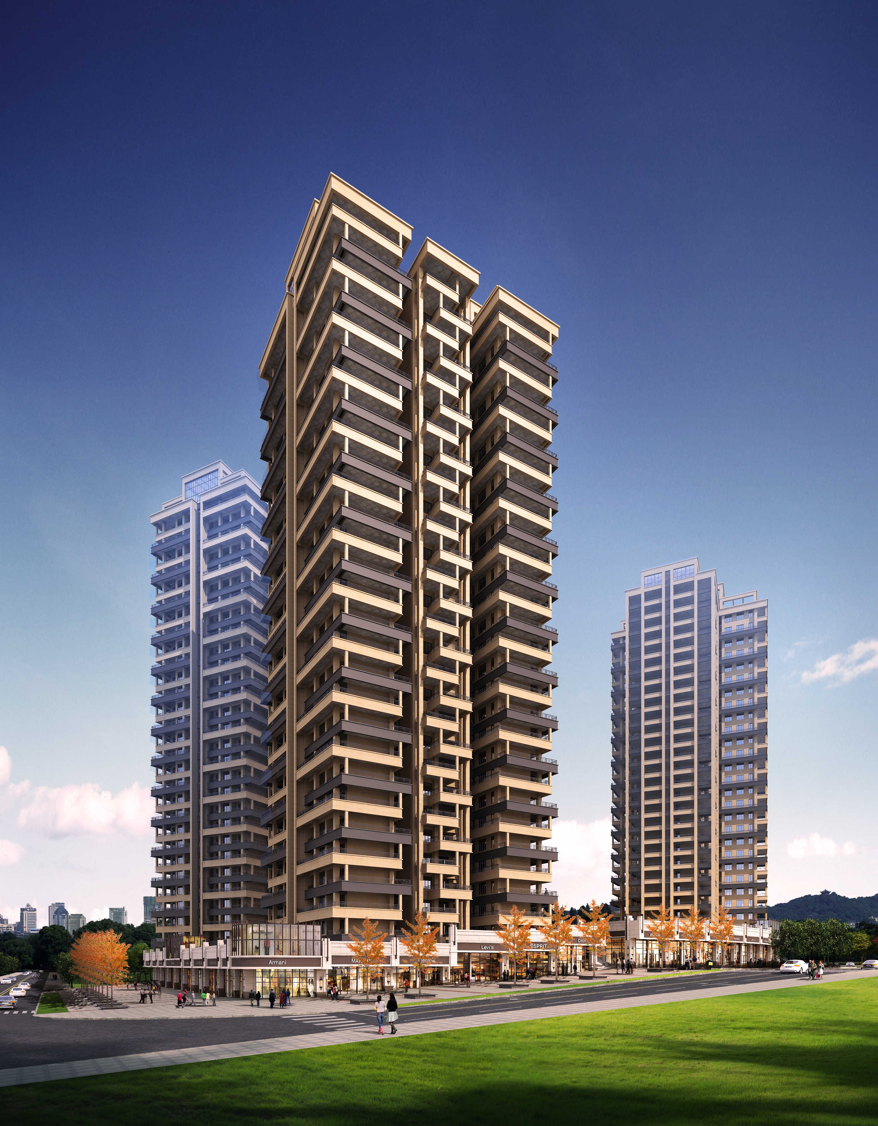 The plan adopts the enclosure layout of the whole high-rise large and middle court,with a total of 4 point-type high-rise buildings designed。The business is arranged in a belt along the road,leaving a larger node of the city square at the main entrance and the back of the building at the intersection of the road,expanding the space of the city road and sidewalk,and providing more leisure space for the citizens。