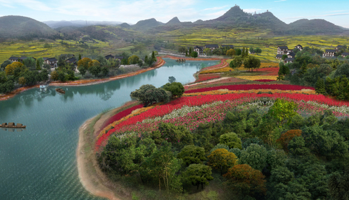 according to the characteristics of the terrain and resources , the design is inspired by the mountains, water systems, woodlands and idyllic areas, emphasiz the beauty of the natural venation, make the modern landscape art through the natural skill to reproduce the beauty of nature, artificial beauty, and pastoral beauty. It’s planning structure is one ribbon, three core, four groups.