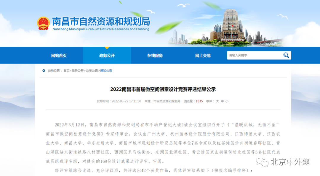 2022年1月10日,在南昌市自然資源和規(guī)劃局發(fā)布了《“溫暖洪城,無微不至”南昌市微空間創(chuàng)意設計競賽》的消息后,我院積極組織設計師參與其中。設計競賽專家評審會于2022年3月12日,在南昌市自然資源和規(guī)劃局拉開帷幕。評審專家對提交的168份設計成果進行嚴格的評審、審閱。