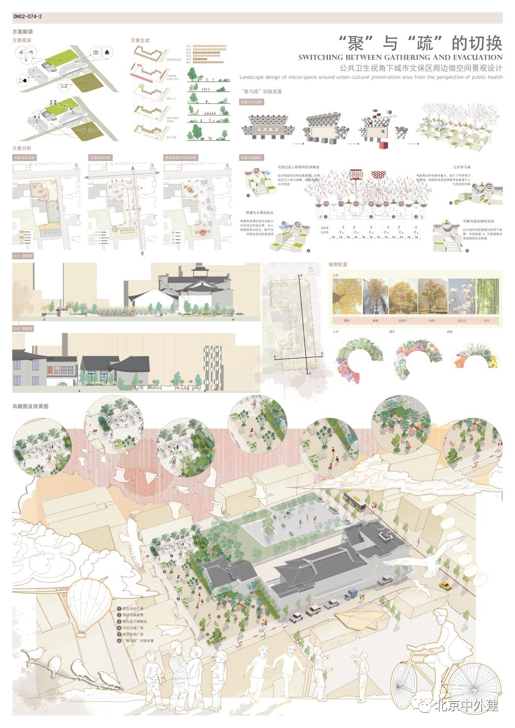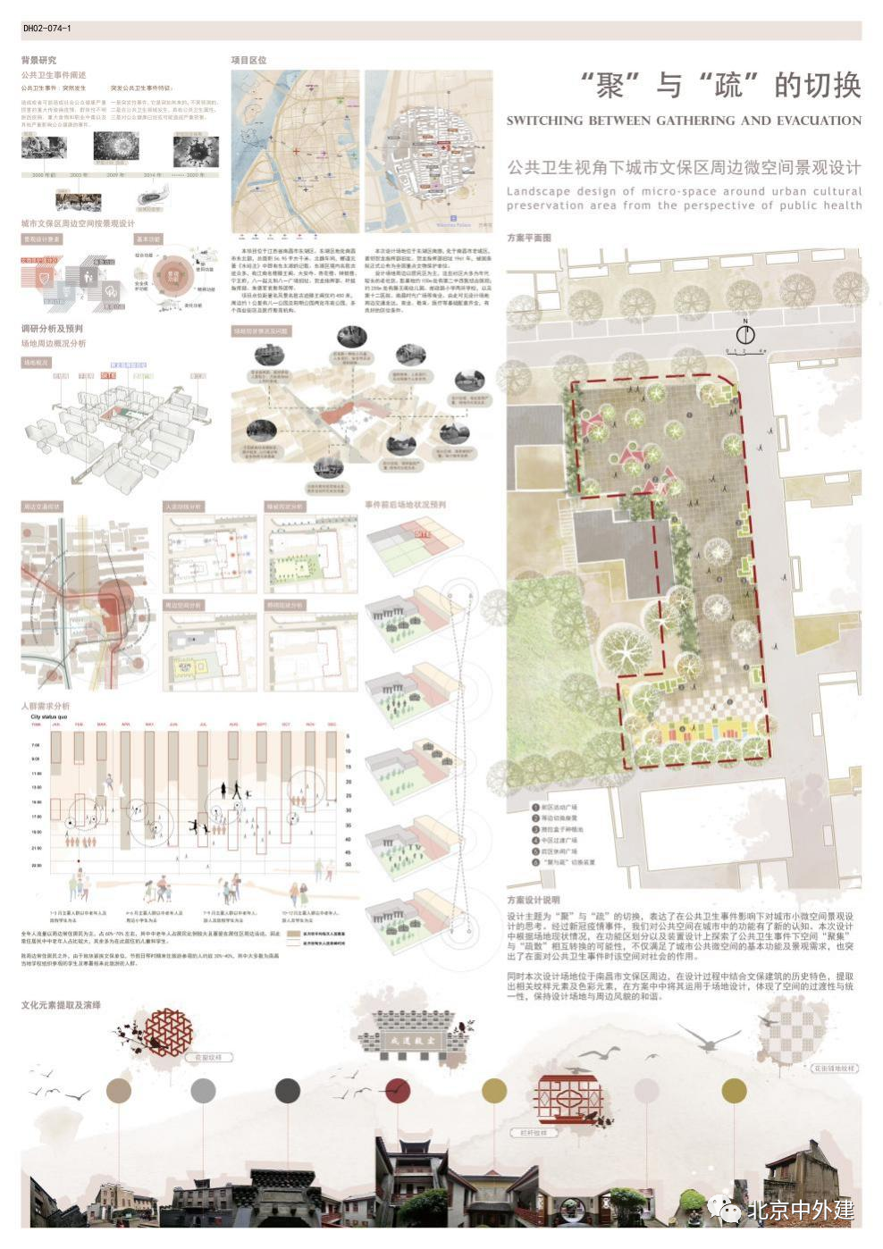 此設計主題為 “聚”與“疏”的切換,表達了在公共衛(wèi)生事件影響下對城市小微空間景觀設計的思考。經過新冠疫情事件,我們對公共空間在城市中的功能有了新的認知。本次設計中根據場地現狀情況,在功能區(qū)劃分以及裝置設計上探索了公共衛(wèi)生事件下空間 “聚集”與“疏散”相互轉換的可能性,不僅滿足了城市公共微空間的基本功能及景觀需求,也突出了在面對公共衛(wèi)生事件時該空間對社會的作用。同時本次設計場地位于南昌市文保區(qū)周邊,在設計過程中結合文保建筑的歷史特色,提取出相關紋樣元素及色彩元素,在方案中中將其運用于場地設計,體現了空間的過渡性與統(tǒng)一性,保持設計場地與周邊風貌的和諧。